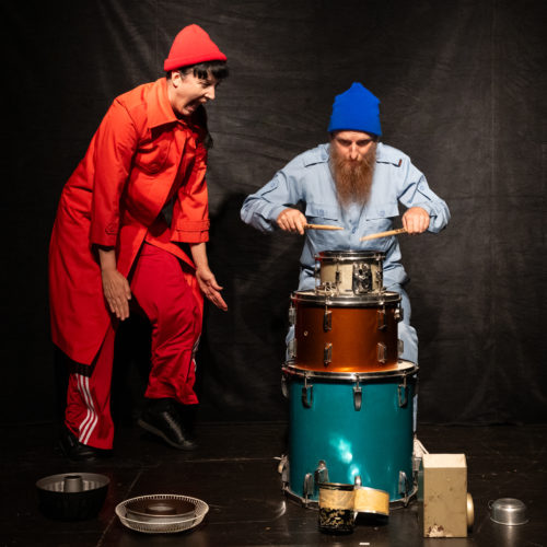 Rot und Blau sind zurück! Mit vielen neuen Fundstücken und jeder Menge Musik auf den Ohren. Sie sind nämlich in ihren Keller hinabgestiegen und haben dort alte Schlagzeugteile und andere tolle Objekte gefunden. Diese Schätze werden vor den Augen des Publikums entpackt und dem ausgemisteten Hausrat die unwahrscheinlichsten und ansteckendsten Klänge entlockt.