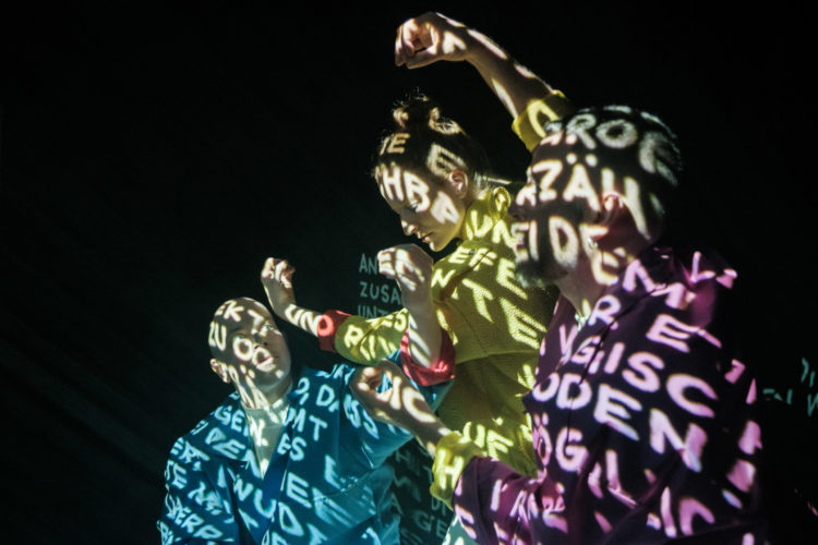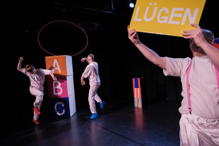 Das Theaterstück zeigt Wörter und Buchstaben auf der Bühne.